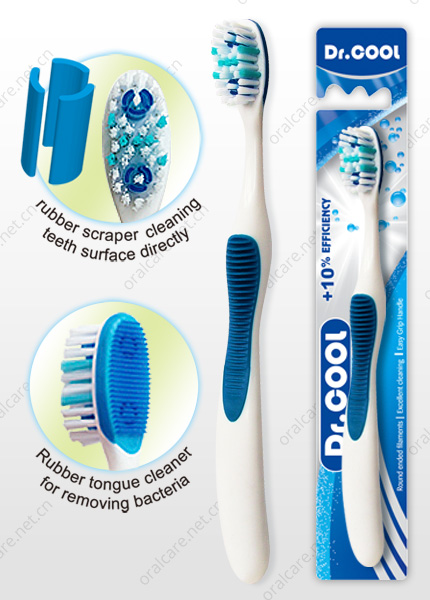 Brand-New toothbrush with two circle shaped rubber scrapers for more effective and direct cleaning on the teeth surface, with tongue cleaning on its head backside, with sofe rubber injected anti-slippy big handle.