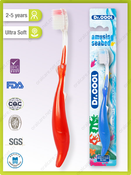 The super kid toothbrush is in dolphin design & in crystal-like plastic material.