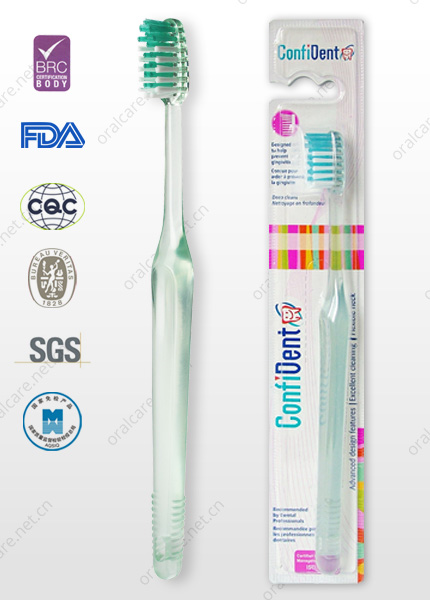 Elegant toothbrush in clear color, with the compact head and the handle in ergomomic shape.