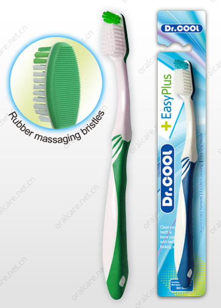 The toothbrush with tongue cleaner is in steamline body with soft rubber covered body for stable and comfortable grip.