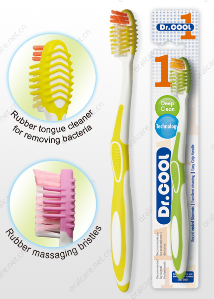 The new toothbrush with rubber massage bristle and tongue cleaner. |