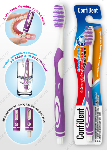 • +  Retractable brush for cleaning false teeth and glass bottom.