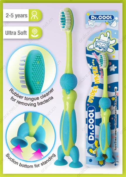 New kids toothbrush in sea lion design with tongue cleaner and two suction buttons.