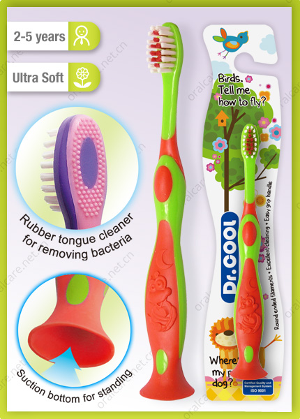 The cute toothbrush which children love.With tongue cleaner and one suction button for standing on the table.