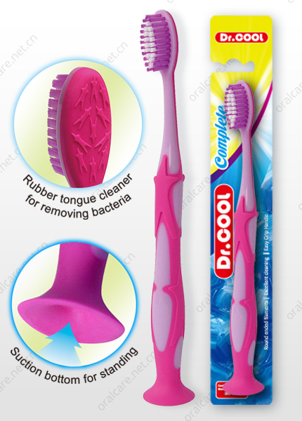 The nice toothbrush with tongue cleaner and one suction button for standing on the table.