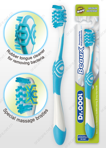 The attractive toothbrush has special gum massage bristles and rubber tongue cleaner.