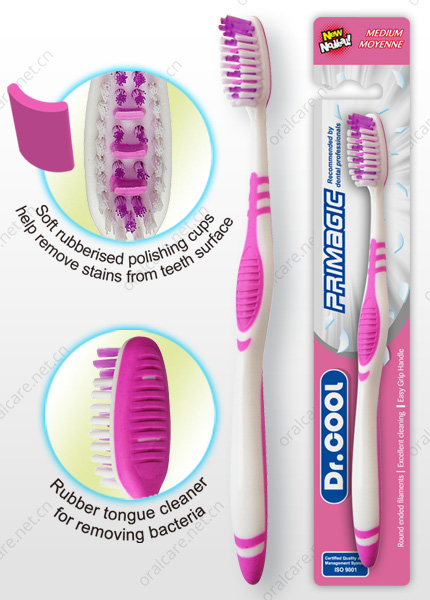 The new designed toothbrush with rubber polishing plates and rubber tongue cleaner.