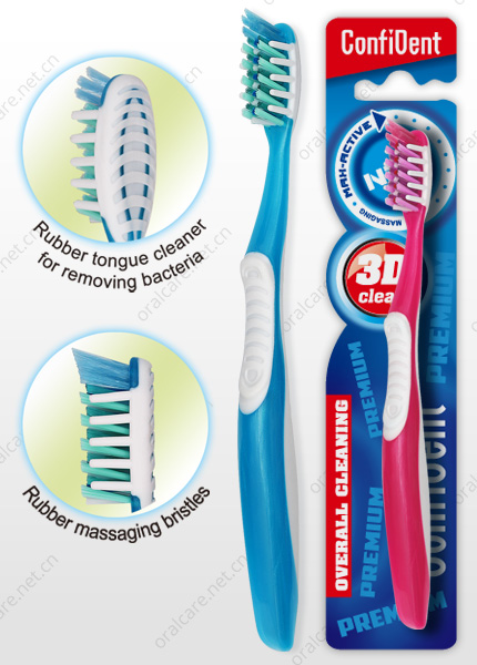 Brand new toothbrush with cross-action bristles, rubber massage bristles and tongue cleaner.